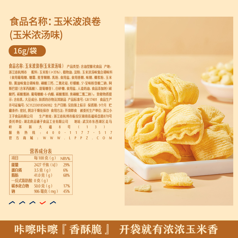 良品铺子玉米波浪卷16gx10袋浓汤味玉米花脆薯片儿童膨化零食小吃薯条儿童虾条散装好吃