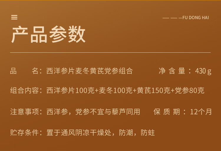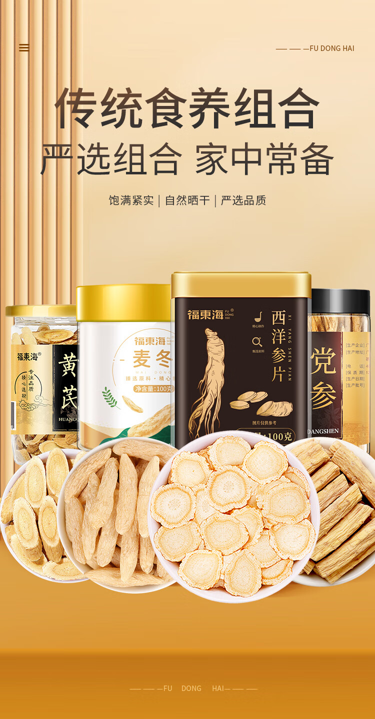 【福东海】麦冬黄芪党参组套455克(麦冬茶125g+黄芪片150g(大片)+党参段80g+西洋参切片100g)FDH01011359