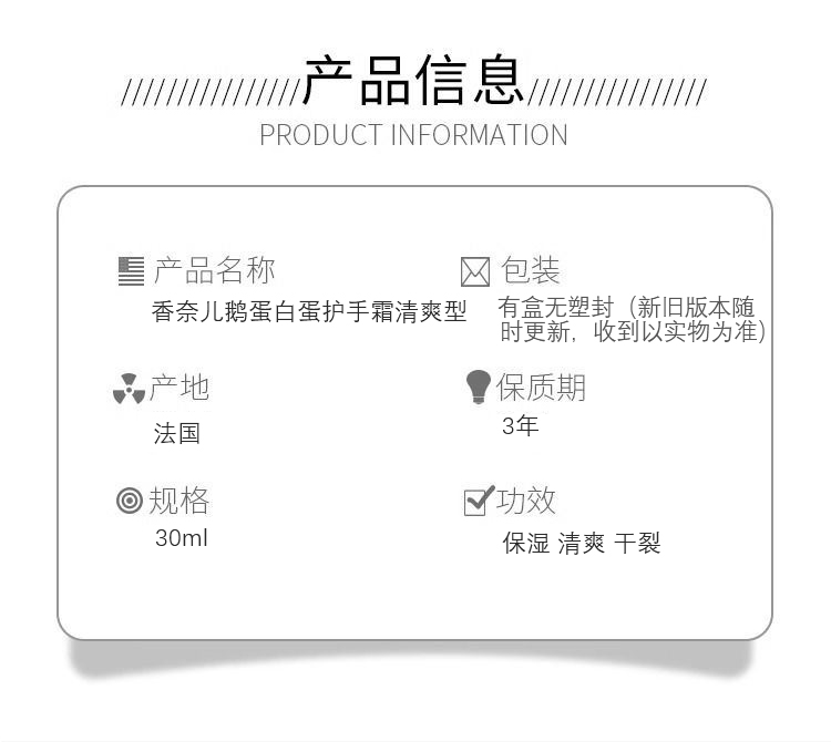 香港直邮【香港直邮】种草推荐--香奈儿鹅蛋白蛋护手霜清爽型30ml 效期至2027年8月