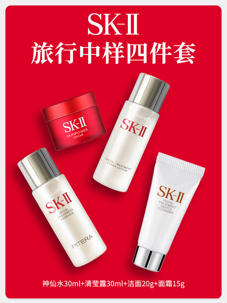 【人气商品】SK-II旅行必备套装 神仙水30g+清莹露30g+洗面奶20g+大红瓶15g